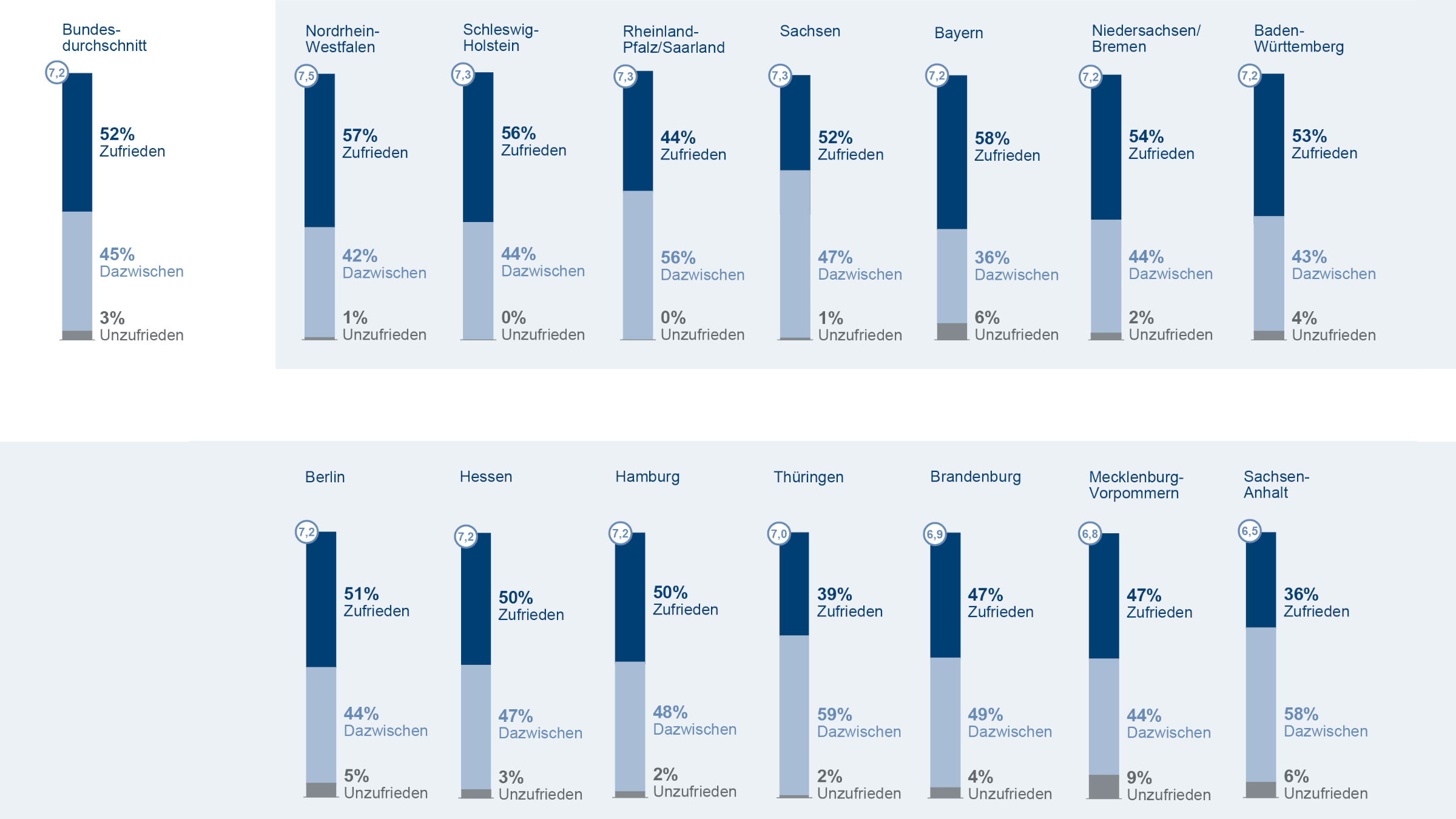 Zufriedenheit ist häufig abhängig vom Eintritt verschiedener Ereignisse mit einschneidender Bedeutung für die eigene Biographie. So zeigen sich bundesweit unter anderem die Menschen am zufriedensten, die in den vergangenen zehn Jahren ein eigenes Haus oder eine eigene Wohnung gekauft haben. Bei ihnen liegt der Zufriedenheitswert auf einer Skala von 0 bis 10 bei 8,0. Genauso zufrieden sind diejenigen, die im gleichen Zeitraum einen Karriereschritt nach oben gemacht haben (7,9). Auch die eigene Hochzeit in den vergangenen zehn Jahren verbessert den Zufriedenheitswert auf 7,8.