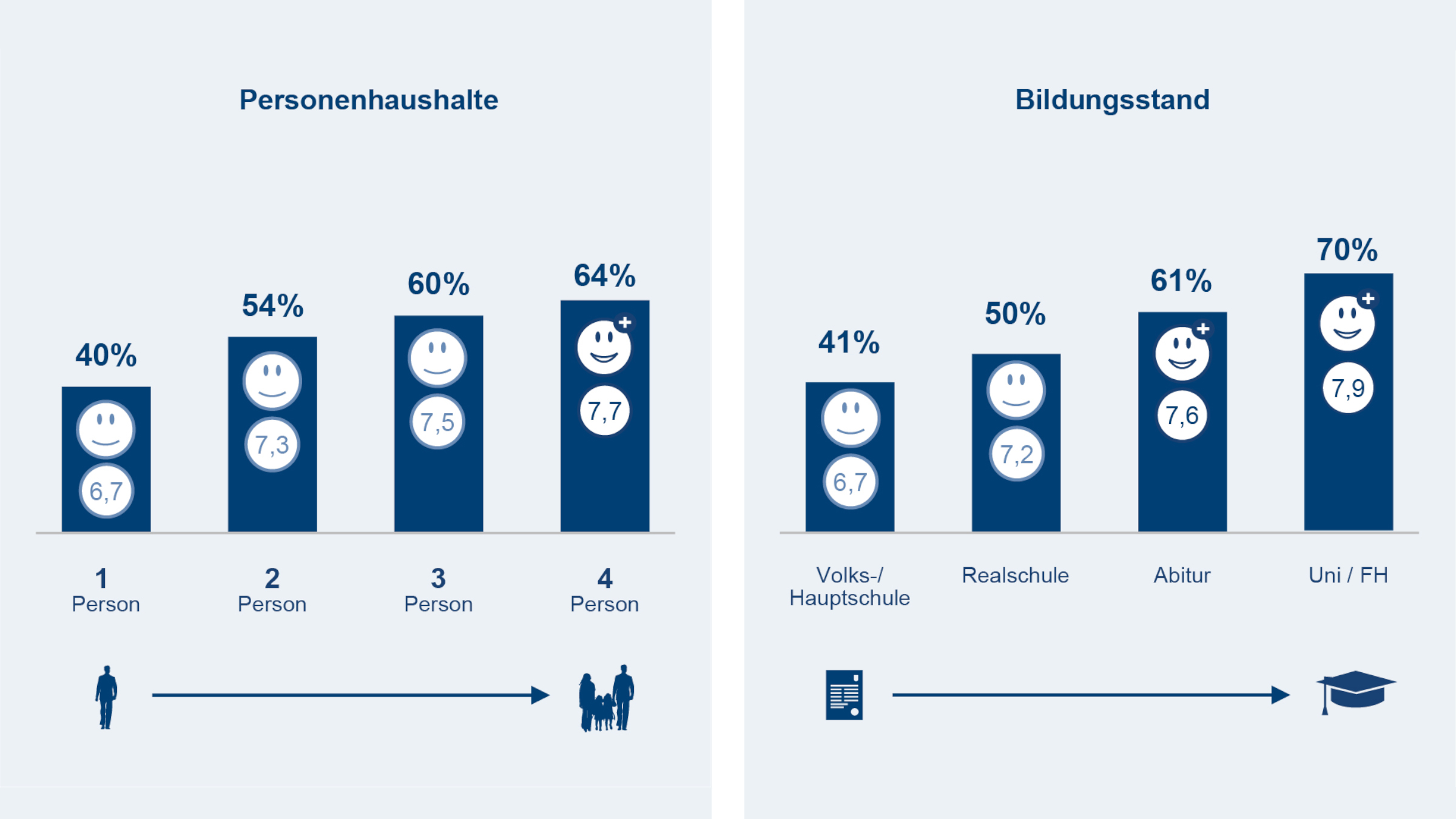 Hinzu kommt: Wer sein Leben allein bestreitet oder bestreiten muss, ist damit weniger zufrieden. Diejenigen, die in den vergangenen zehn Jahre eine Scheidung durchgemacht haben, deren Lebenspartner verstorben ist oder wer als Single lebt, äußert sich eher unzufrieden: Menschen, die in einem Ein-Personen-Haushalt leben, kommen auf der Zufriedenheitsskala nur auf 6,7. Wer hingegen im (mindestens) Vier-Personen-Haushalt lebt auf 7,7.