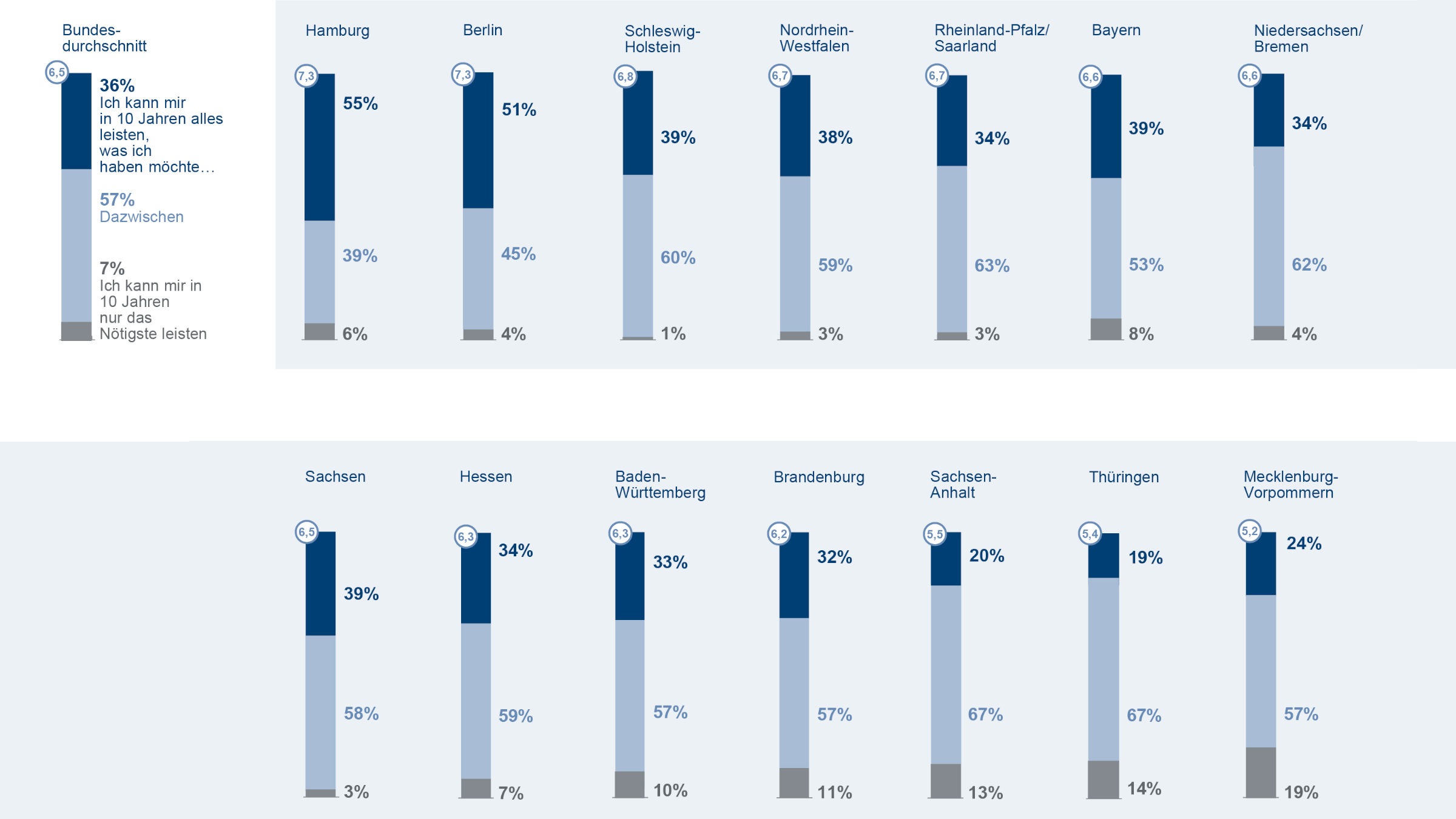 Die Studie zeigt, dass zufriedenere Menschen optimistisch nach vorn blicken. Wer zufrieden ist, glaubt häufiger, die finanzielle Zukunft selbst in der Hand zu haben. Drei Viertel (75 Prozent) der zufriedenen Menschen bundesweit meinen, dass sie durch ihr eigenes Sparverhalten beeinflussen können, wie sie in zehn Jahren finanziell aufgestellt sind. Unter denen, die unzufrieden sind, sagen dies nur 36 Prozent. Nur rund ein Drittel der Deutschen (34 Prozent) glaubt nicht daran, die eigene finanzielle Zukunft selbst gestalten zu können.