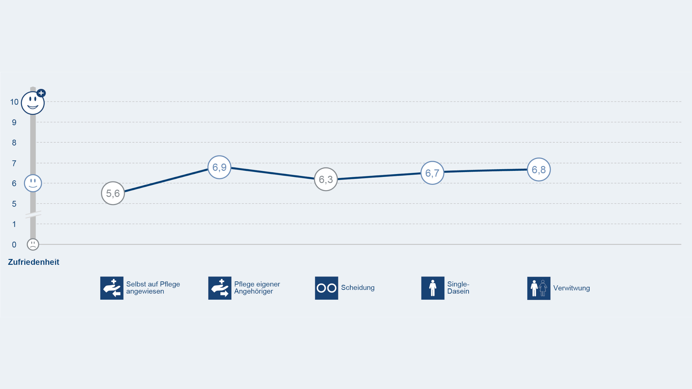 Die größten Zufriedenheitskiller sind deutschlandweit negative Lebensereignisse in den zurückliegenden zehn Jahren. Ganz vorne liegen hier vor allem Themen, die in der Familie oder im persönlichen Umfeld für große Veränderungen oder Belastungen sorgen. Besonders gravierend sind einschneidende Lebensereignisse, die mit dem Alter zu tun haben. Ganz vorne liegt dabei die eigene Pflegebedürftigkeit. Menschen, die auf Pflege angewiesen sind, haben den niedrigsten Wert auf der Zufriedenheitsskala (5,6). Aber auch diejenigen, die Angehörige pflegen, sind
